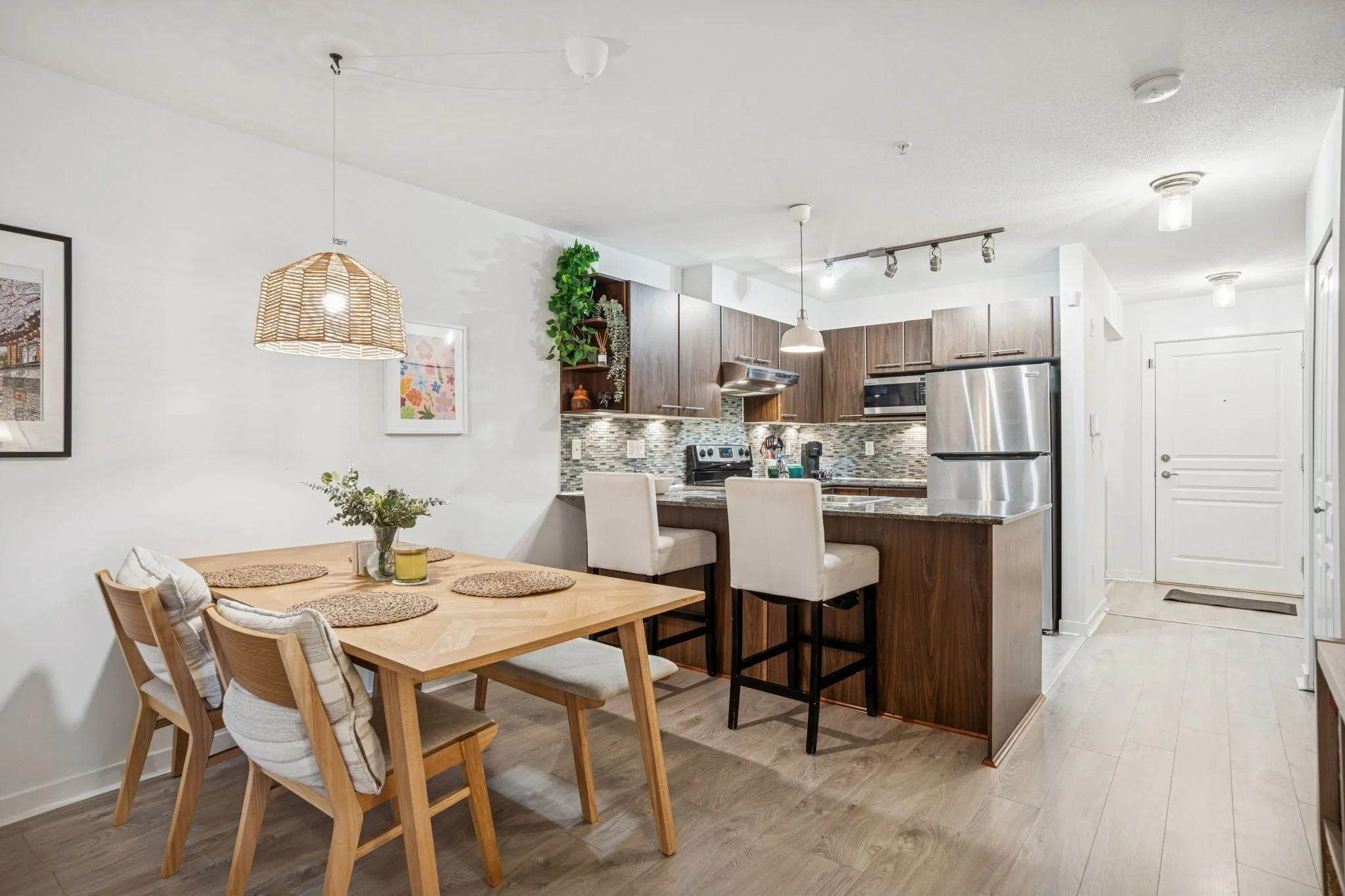 An expansive 1 bedroom home with a yard, and 2 parking - a rare offering in Brentwood Gate's The Varley. This this well-laid-out ground-floor home offers open-concept living with a spacious kitchen featuring granite countertops, stainless steel appliances, and a flex area perfect for a home office, or storage. The dining room has plenty of space for friends and family to visit comfortably, and the private patio and yard (over 300 sf total) mean more time outdoors. Located just steps to Brentwood Town Centre, SkyTrain, shops, restaurants, and parks, all within a well-managed, pet-friendly complex.